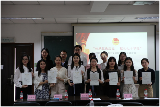 2019年5月20日,为纪念中华人民共和国成立70周年、五四运动100周年,马克思主义学院研究生团支部在西溪校区教学主楼1025教室举行了以“传承红色历史,献礼七十华诞”为主题的微团课比赛。经过各党支部初赛,此次微团课比赛共有8件作品进入总决赛。本次总决赛由中国近现代史纲要教研中心老师张立程、德育老师方瑞、中国特色社会主义研究中心秘书杨赟悦、2017级硕士研究生林威和徐聪聪担任评委。