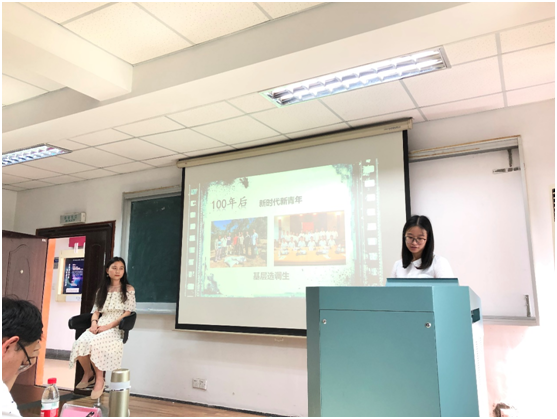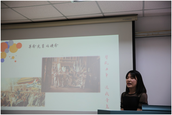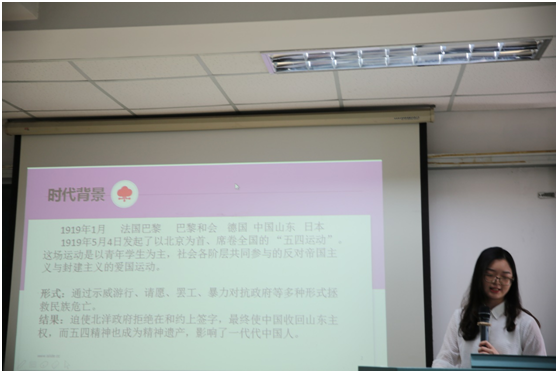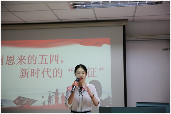 参赛选手依次进行展示。赵欧阳和莫珂璐首先抛出“青春是什么?”引起大家思考。她们先从100年前的青年们身上找寻青春的答案,而后把时间推进到今天,从当代青年身上找寻何为青春。最后点明青春就是永远与祖国在一起,青春具有延续性,同时号召同学们青春当奋斗。