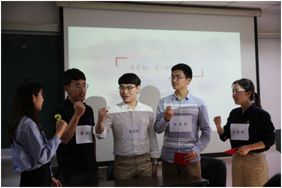 吴赞儿、徐墨岩、叶思宇、张登皓、李硕先用情景剧的形式生动再现了在嘉兴南湖上召开中共一大的情形,而后明确了在南湖上的那艘红船对中国共产党的伟大意义,最后具体阐述了红船精神的历史内涵和价值意义。