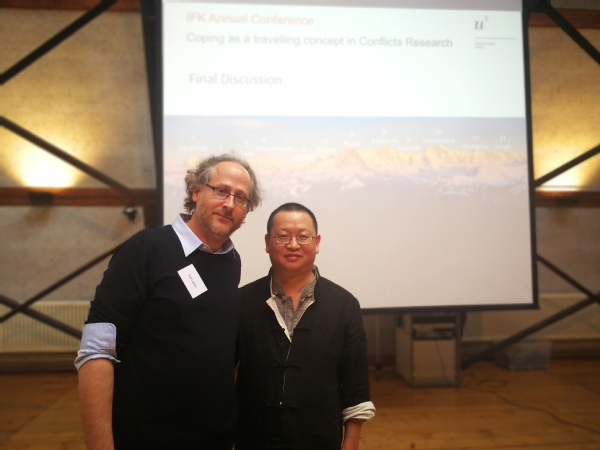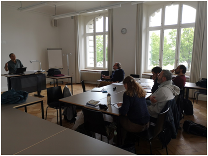 5月6日的课题组年会从早十点开始,到晚上九点结束,地点伯尔尼大学教学主楼顶层的圆顶会议室举行,这是伯尔尼城的最高点,可以俯瞰整个老城区,清晰地看到伯尔尼城南不远处连绵不断白雪覆盖的阿尔卑斯山。年会分三个阶段,上午是校方的欢迎仪式和课题组组长的主题报告,伯尔尼大学副校长Silvia Schroer和项目副主任Martino Mona致欢迎辞,项目主任卡特琳娜教授做主题发言:“应对作为冲突研究中的变动概念:模型的构建”(Coping as a Travelling Conceptin Conflict Research: Towards anAnalytical Model),项目组学术委员会进行了简短回应;下午是十二个子课题组分为三组进行小型研讨,就不同的专题介绍进展情况和主要的学术观点,学者们发表意见,最后全体集中,大组派人报告讨论情况,最后全体问题环节。晚上英国伦敦都市大学著名宗教冲突与合作学者杰弗雷(Jeffrey Haynes)举办了“从享廷顿到特朗普:文明冲突三十年”的公开讲座。[2]5月7日 “冲突的认识论根源” 子课题组在主楼Room 028举办了小型研讨会,主题是“冲突的构建:比较视野中的自我与他者之设定”,张新樟做了“中国化马克思主义哲学对于冲突之本质及其应对的思考”[3]。