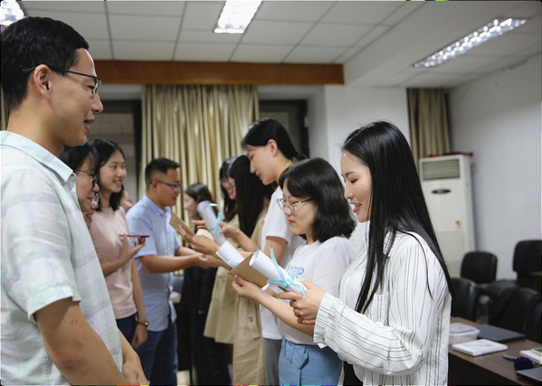 讨论接收预备党员支部大会结束后,学生第二党支部全体成员一同观看了为毕业生党员精心制作的视频,并通过“马院最棒”“你划我猜”等游戏,共同回忆了毕业生党员在马院的成长时光。紧接着,二支部学生代表向毕业生赠送特别纪念品,同时,支部书记潘颖超代表支委会送出寄语祝福,毕业生党员代表许聪聪、孙丽云、蓝肖菲等表示衷心感谢。