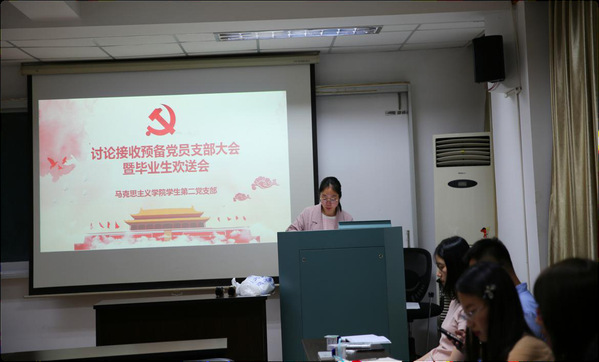 根据党支部发展党员工作计划,经上级党委预审同意,讨论两位发展对象的入党问题,同时为欢送2017级毕业生党员,6月13日下午,马克思主义学院第二党支部在教学主楼1025教室开展了讨论接收预备党员支部大会暨毕业生欢送会。活动由支部书记潘颖超主持。