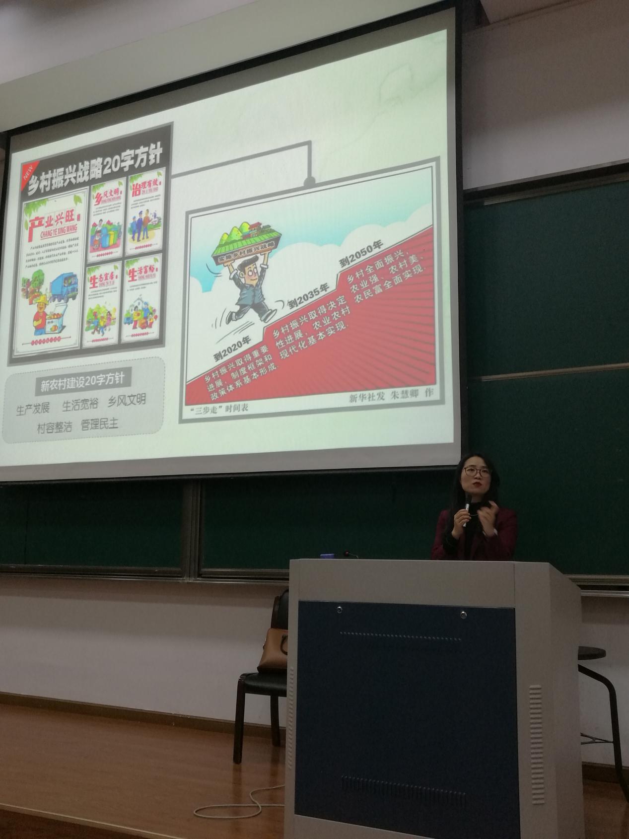 林爱梅处长首先从“乡村为什么要振兴?”、“乡村怎样振兴?”的问题出发,讲明了乡村振兴的必要性。在此基础上,详细介绍了浙江“千村示范,万村整治”的基本历程,总结了浙江在美丽乡村建设方面的主要经验。接着,围绕乡村振兴的五大振兴内容,用不同的案例阐明了乡村振兴的具体路径,如“建设美丽乡村促进生态振兴”、“发展美丽经济促进产业振兴”、“深化改革促进组织振兴”、“形神兼具促进文化振兴”、“广纳人才促进人才振兴”。作为浙江“千万工程”的直接参与者以及相关农业政策的执行者,林处长也谈到部分农村在美丽乡村建设方面由于规划不足留下的遗憾。最后,她还介绍了党对“三农”工作的具体政策,尤其是一些经济发达地区在引导工商资本回流、大学生回村方面的优惠政策,描绘了乡村未来发展的美好画卷,呼吁同学们关注乡村振兴、投身乡村振兴。