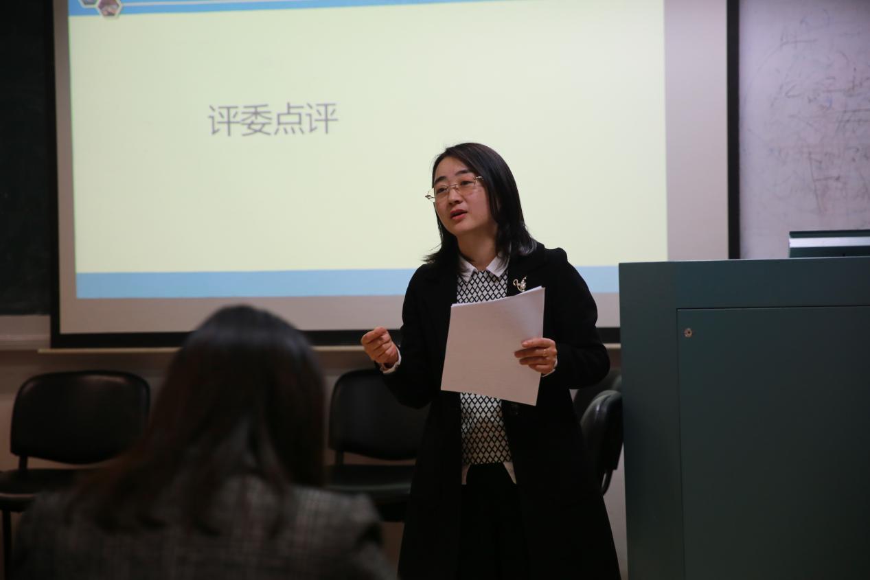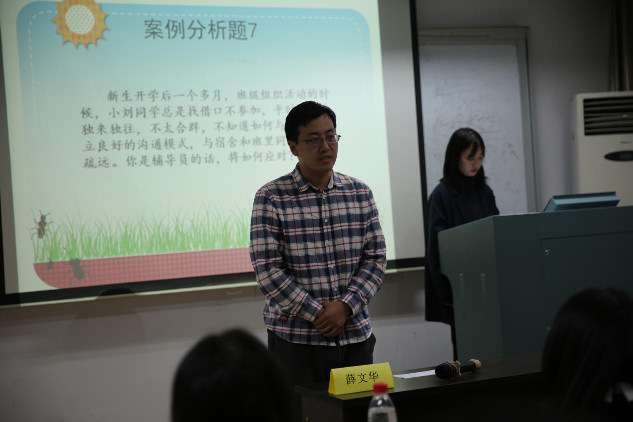 首先进行的是案例分析环节,六名同学按照抽签顺序依次上台进行展示。展示内容包括自我介绍、案例分析和回答评委提问三个环节。面对贴近现实、设计巧妙的现实案例,同学们表现出处变不惊的良好职业能力。本次案例设计涵盖学生思想、家庭、学业等多个角度,真实再现了辅导员日常工作常见问题。在每位同学们的展示环节后,评委老师都从专业角度提出了中肯的建议。针对同学们自我介绍的普遍问题,王珏老师指出,在有限的时间内表现自己最优秀的特色,是自我介绍要达到的最终目的;面对案例分析中学生思想棘手问题,楼艳老师强调了辅导员工作的思想教育性,指出在进行思想引导工作时要敢于“亮剑”。除此之外,其他评委老师也分别从案例分析的针对性、提出措施的现实性,结合自身多年的工作经历,给同学们提出了指导意见。