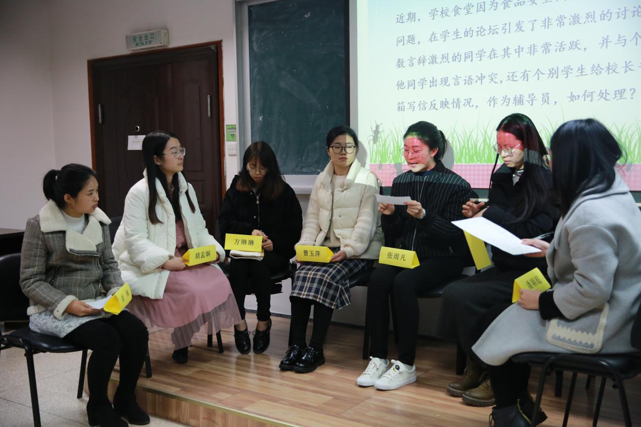 为进一步提高“未来辅导员训练营”学员相关技能的实际运用能力,2019年11月29日,马克思主义学院于教学主楼1025室顺利举办第三期“未来辅导员”之职业技能实操训练课程。此次活动邀请到了浙江大学人文学院党委副书记楼艳、浙江大学机械工程学院党委副书记项淑芳、浙江工业大学机械工程学院党委副书记章嫦华、杭州传媒学院党委学工部部长王珏以及浙江树人大学国际交流与合作处直属党支部书记严伟伟担任评委老师。来自全校各个学院的24名同学参与了本次活动。本次课程按照辅导员面试流程设有案例分析和无领导小组讨论两个环节。