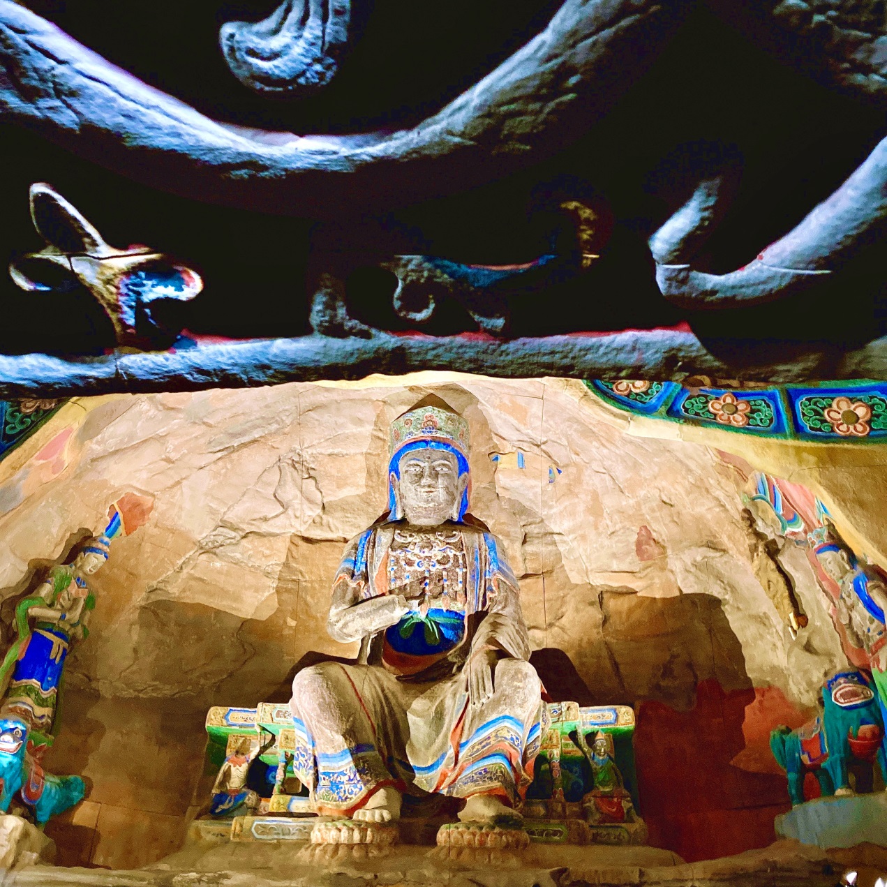 震撼人心的展厅三就是白老师说到的由3D打印技术实现的云岗12窟,经过人工着色,展厅里的石窟更显艳丽恢宏。邢老师带着同学们细数佛像手中把玩的乐器:高丽族、汉族,笛、琵琶、筝、埙……丰富多样,极好的诠释了民族融合与时代的开放。礼乐祥和、喜气玲珑,果真是邢老师所说的西方极乐世界。