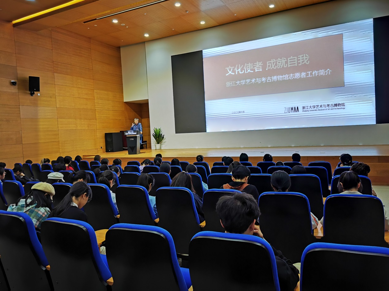 在开始参观艺博馆之前,全班学生齐坐馆内报告厅中,认真聆听浙大艺博馆党委书记白承镐老师以及浙大艺博馆宣传教育部副部长赵海燕老师关于艺博馆基本知识和艺博馆志愿者的讲座。