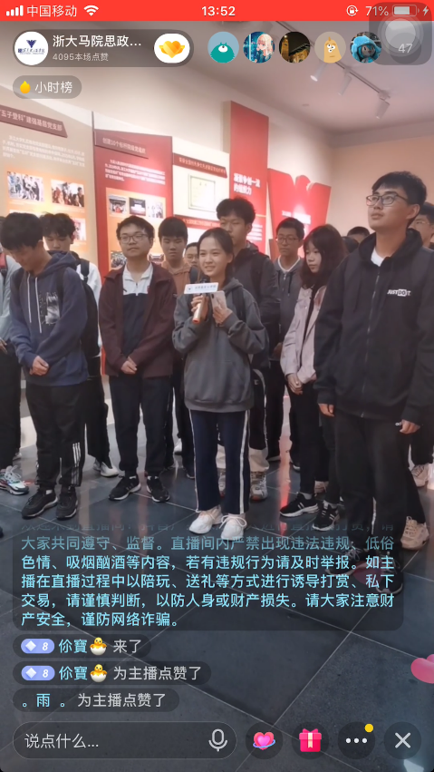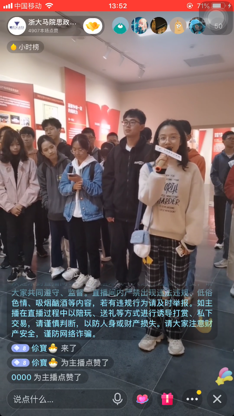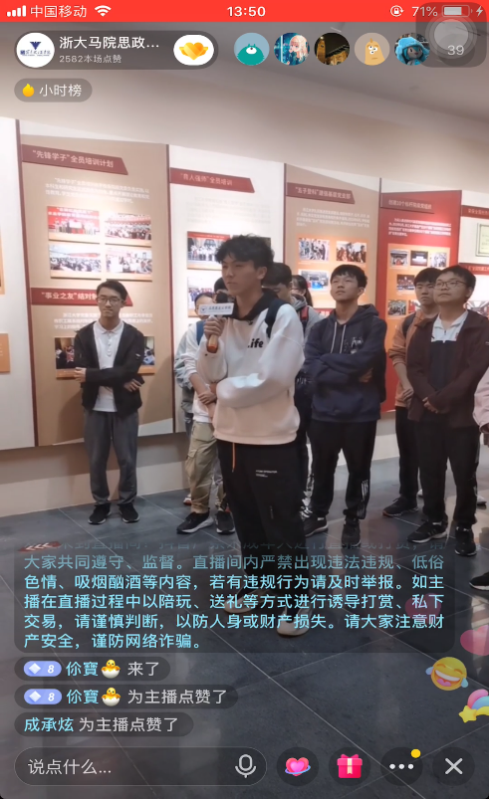 此次直播现场教学的整个过程内容充实。校党建馆的专业讲解员详细介绍红船精神以及浙江大学党建工作。在现场,同学们在讲解员介绍一张张珍贵的历史图片、一位位曾经鲜活却为革命事业献身的共产党员的英雄事迹中,了解到了历史教材中未能深入探讨到的内容,深感中国共产党一路走来的艰难险阻与不易,更加激发了同学们的爱国主义情怀。讲解结束后,到场学生就相关问题进行的精彩互动交流。同学们纷纷出镜,踊跃发表自己的感悟。