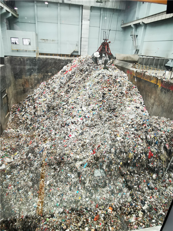最后,师生一行到达垃圾进料处。这里有许多大型抓斗,它们一次能抓取十吨垃圾。这些垃圾要在高处经历三至七天的发酵,最后再进行焚烧。焚烧的余热用来发电,残渣用于制砖,而烟气会进入烟气净化系统,只有水蒸气会向大气排放。这些处理使焚烧过程符合了国家标准,而公司为了达到超低排放指标,还增加了SGH、GGH等设备。焚烧厂采用自然堆放发酵,仅依靠垃圾自身重力,不需任何添加。同时,除了起炉外,焚烧也是不用助燃物的,真正做到了节能减排。工作人员还耐心解答了梁老师“为什么闻不到垃圾恶臭”的问题。原来焚烧厂使用负压系统,将垃圾仓内的臭气抽送至炉内进行焚烧,内部也是密封的,因此“经得起闻”。这也解决了许多同学的疑惑。