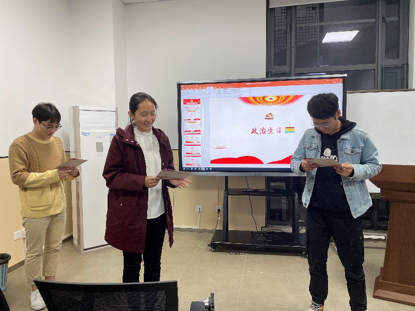 在给支部党员过政治生日环节,李岩书记代表党支部给此次过政治生日的范宁宇同志、冯小桐同志、张登皓同志赠送了“政治生日贺卡”,三位同志依次表达了在未来学习生活中对自己的要求和期许。