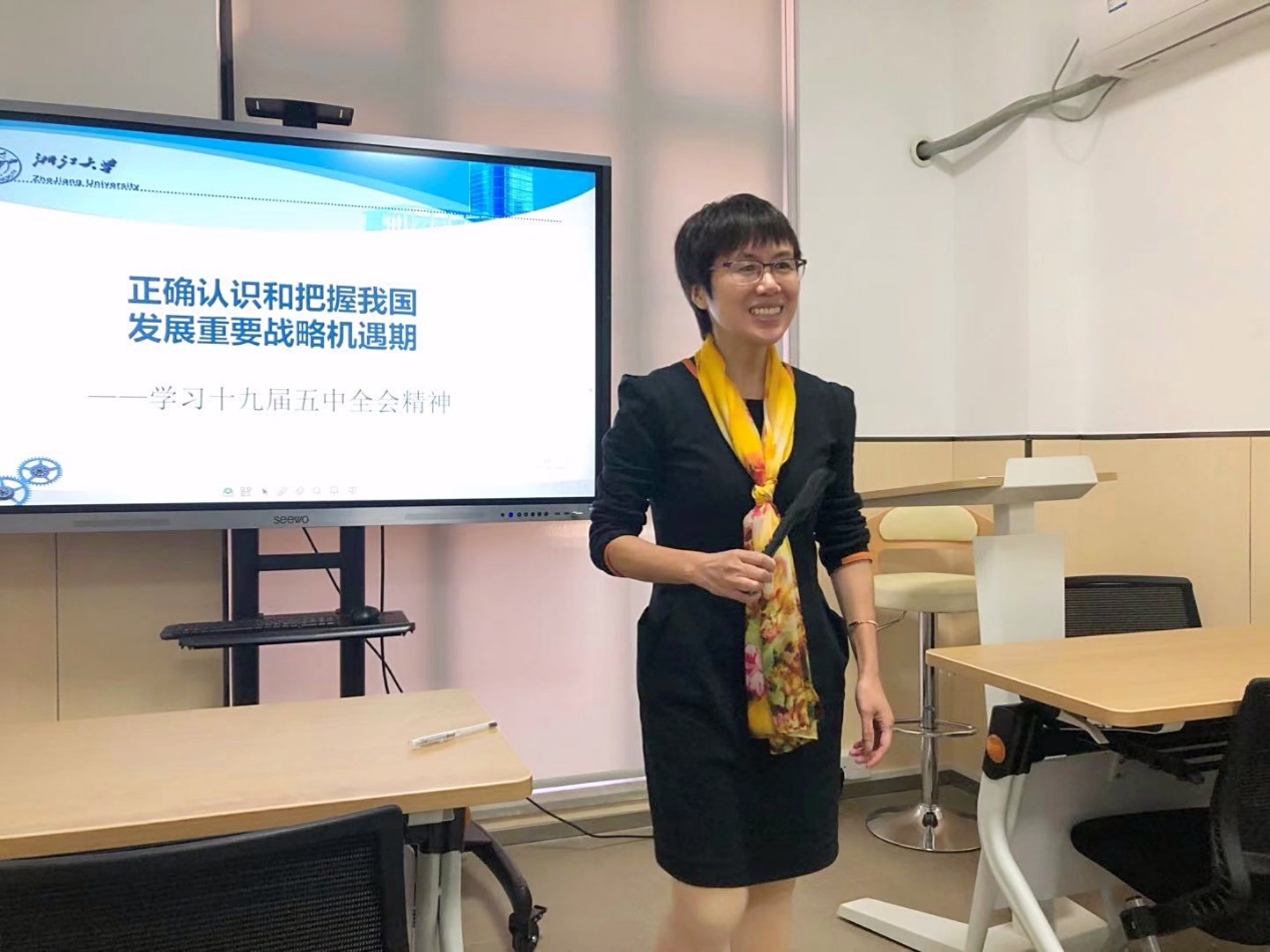 教研室主任傅夏仙老师为大家讲解了学习领会十九届五中全会精神的要点,并着重强调了教研室全体教师要深入领会十九届五中全会精神,把会议精神贯彻到课堂教学之中,把会议要点讲深讲透,使“概论”课走在宣讲中央精神的前列。
