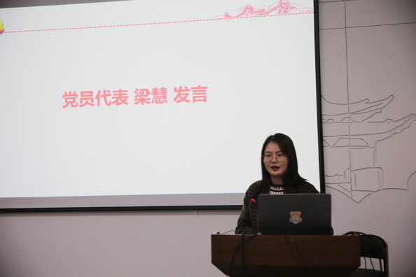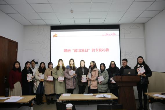 会议第三项为支部成员许雪林等13名同志举办政治生日。首先,支部书记桑建泉师和支委郭子璇为同志们赠政治生日贺卡及生日礼物。接着,在合影留念后,党支部副书记马甜甜带领与会党员重温入党誓词。最后,此次过政治生日的代表梁慧同志从老一辈党员舍身报国的崇高情怀,到当下青年学子的责任与担当,她用自己的真实经历向大家分享了她和党的故事,令在场党员无比感动。这项活动深深地强化了党员的身份意识和责任意识,进一步激发了党员的政治热情。
