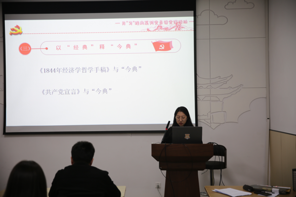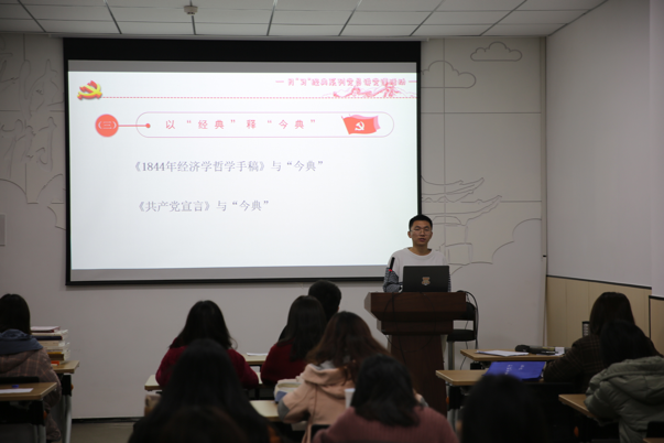 大会第二项进行了月“习”经典系列党员讲党课的第二次活动。每月以“经典”释“今典”的理论学习模式,巧妙地与“三会一课”相融合,极大提升了支部党员的学习兴趣。此次党课主题是——从《手稿》、《宣言》看脱贫攻坚大智慧。12月3日,中共中央政治局常务委员会召开会议,习近平总书记发表重要讲话,他指出,经过8年持续奋斗,我们如期完成了新时代脱贫攻坚目标任务。根据马克思在《1844年经济学哲学手稿》中对无产阶级的普遍贫困现象的分析、在《共产党宣言》等著作中对未来社会的理想状态进行的描绘,第二小组成员认为习近平关于脱贫攻坚要坚持和发挥中国制度优势的思想,是对马克思恩格斯关于反贫困的社会制度条件思想的发展和创新,实现了“今典”与经典的巧妙融合。