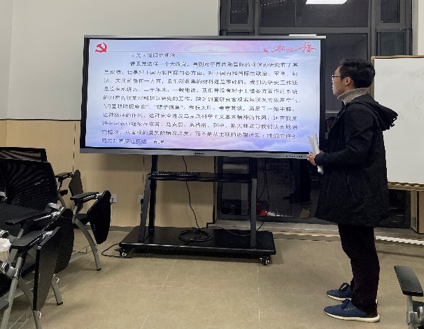 随后,支部副书记游志纯同志就党支部如何开展学风建设提出了建议和要求。他通过分享毛泽东同志的经典篇目《改造我们的学习》,以及学习习总书记提出的“中国共产党人依靠学习走到今天,也必然依靠学习走向未来,学风问题关系党的基础,关系党的前途和命运”的精神引领,希望我们支部同志能够继续秉持实事求是,理论与实际相结合的学风作风,将论文写在中国大地上。