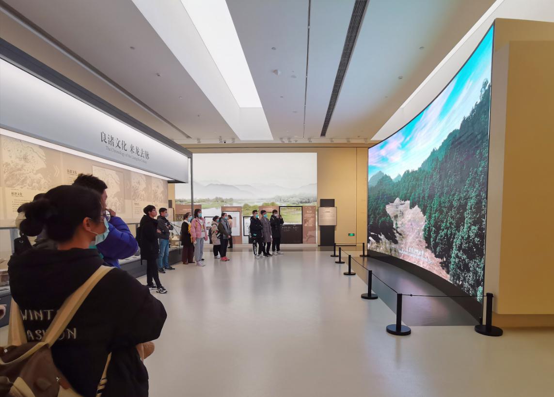 从序厅右我们进入了第一展厅,这里概括性地介绍了良渚文化的基本内涵和它的分布范围。在展厅一侧,墙壁电子屏幕的场景向我们生动形象地展示了当时的生态环境和先民的日常生活场景,营造了浓郁的文化氛围,我们被这里深深所吸引。