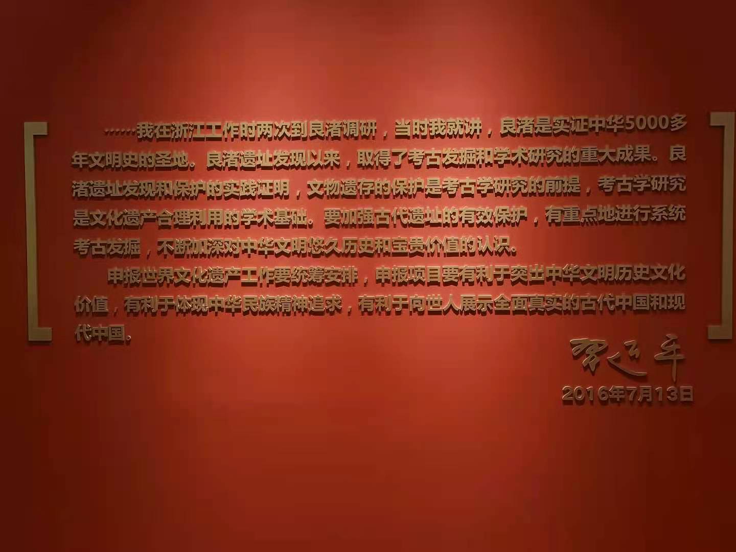 首先我们进入了临时展厅,映入眼帘的是习主席对良渚文化的评价话语;我们继续前行,又见到了良渚文化追溯时间的研究概括,不由得对良渚文化之悠久感到震撼。