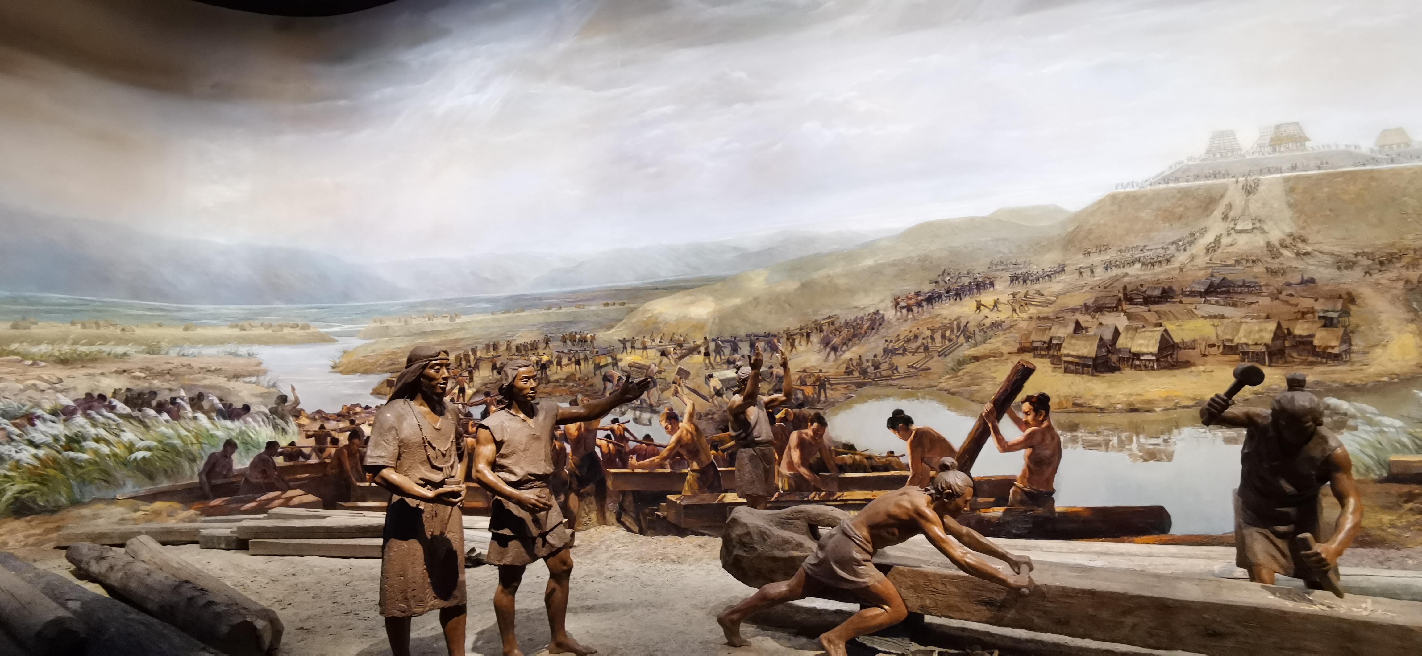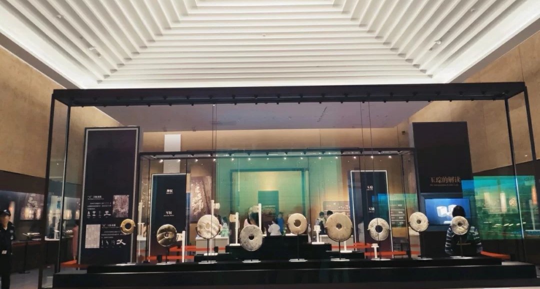 陈列馆分为申遗序厅与三个展厅,展厅又各具不同的主题,力图全面展示良渚文明的风貌。在探秘文明的好奇心驱使下,同学们有序参观了四个展厅。进入第一展厅——水乡泽国,恍若跌入了千年前的生活图景。展厅通过陈列水稻种植的生产方式,陶器、竹木器、漆器生活用具,房屋建筑,刻画符号的实物展示,让我们初步走近良渚人民的饮食住行。同时展厅溯流了良渚文明的发展,良渚文化的来龙去脉亦显得愈发清晰。接着同学们来到第二展厅,第二展厅题为文明圣地。展厅内有良渚人民的作坊区、庙前村落、卞家山码头、沈家山居住区,并额外设立了多个塑像展区以及一个球幕影厅,更全面直观地展现了良渚人民的日常生活和劳作活动图景。步入第三展厅——玉魂国魄。映入眼帘的就是良渚社会的社会等级示意图,依据等级分配有不同的玉器。原来玉器不仅是观赏的器物更是权力地位的象征,玉器的种类直接显示了神权与人权的大小。更让人叹为观止的便是玉器上图纹的精细程度,在当时技术条件简陋的状况下有此等的杰作,让人不由得感叹史前文明之璀璨。