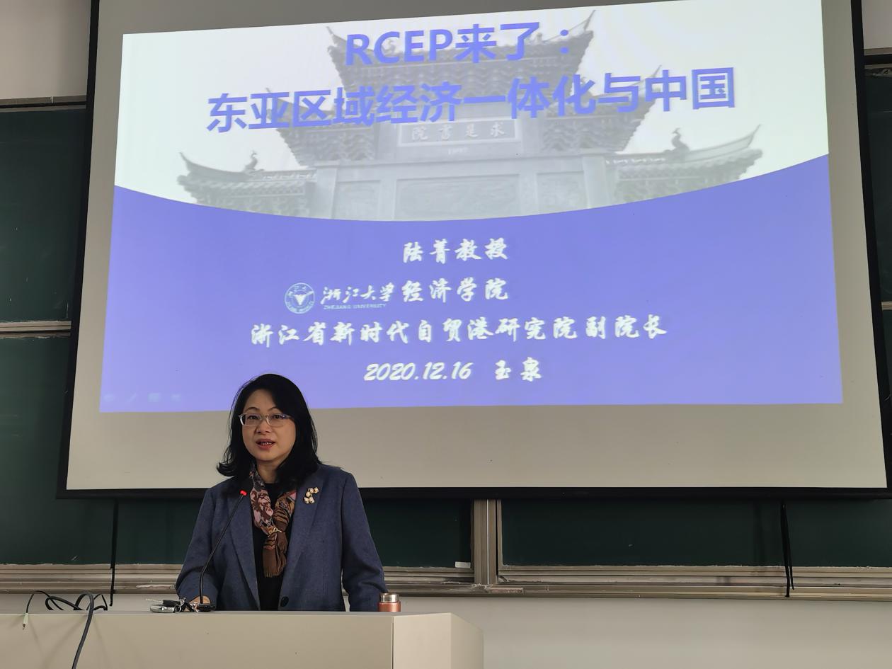 什么是RCEP?它会带来什么样的影响和变化?12月16号下午1:15分,玉泉校区曹光彪二期205教室,浙江大学经济学院教授、博士生导师、浙江省新时代自贸港研究院副院长、浙江省国际经济贸易学会副会长陆菁老师走进“概论”课堂,带来了“RCEP来了 ——东亚经济一体化与中国”的专题报告。