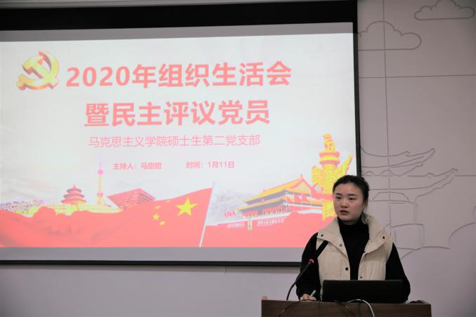 1月11日下午,马克思主义学院硕士生第二党支部在马院107教室召开2020年度组织生活会暨民主评议党员大会。学院党委副书记徐晓霞老师、专职组织员何舫老师出席此次会议。会议由党支部副书记马甜甜同志主持。