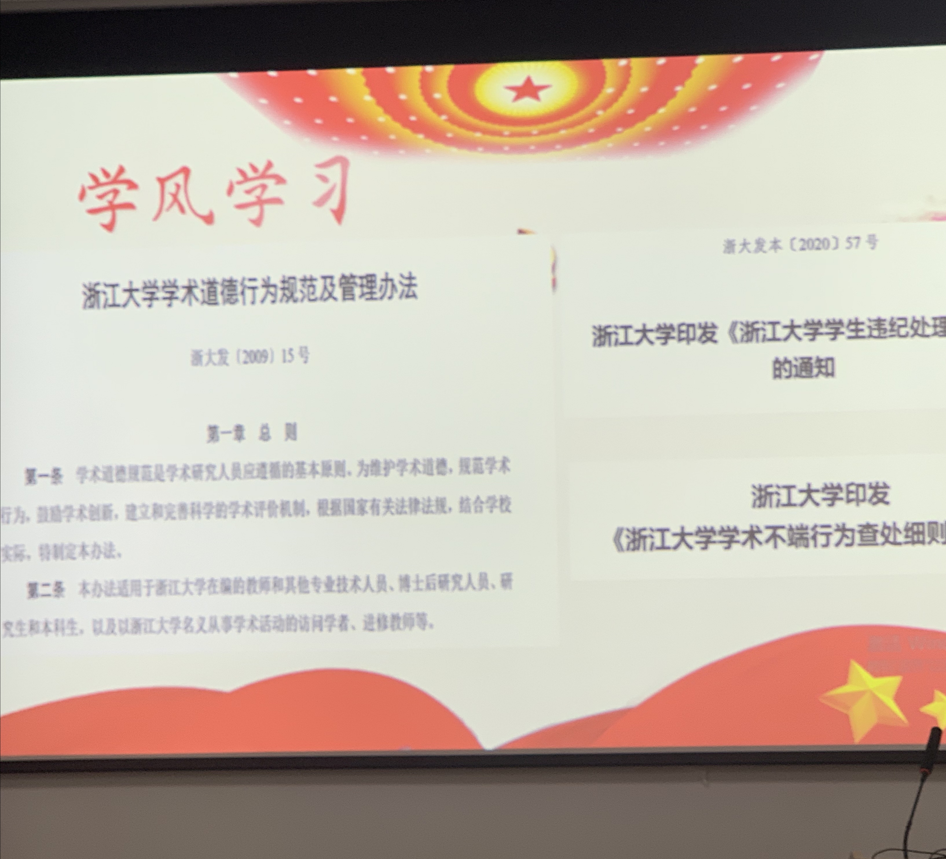 会议第四项,支部书记陈婧洁同志带领全体党员同志学习了《浙江大学学术道德行为规范及管理办法》、《浙江大学学生违纪处理办法》、《浙江大学学术不端行为查处细则》,强调每一位党员同志都要自觉增强纪律意识,推进学风建设,筑牢思想基础。