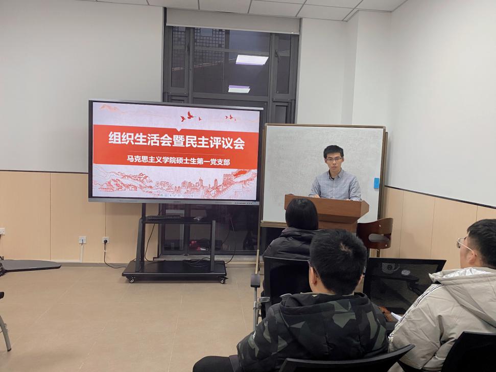 1月20日下午,马克思主义学院硕士生第一党支部于学院104教室召开2020年度组织生活会暨民主评议党员大会。出席本次会议的有学院党委副书记徐晓霞老师、专职组织员何舫老师。本次会议由党支部副书记陈宇轩同志主持。