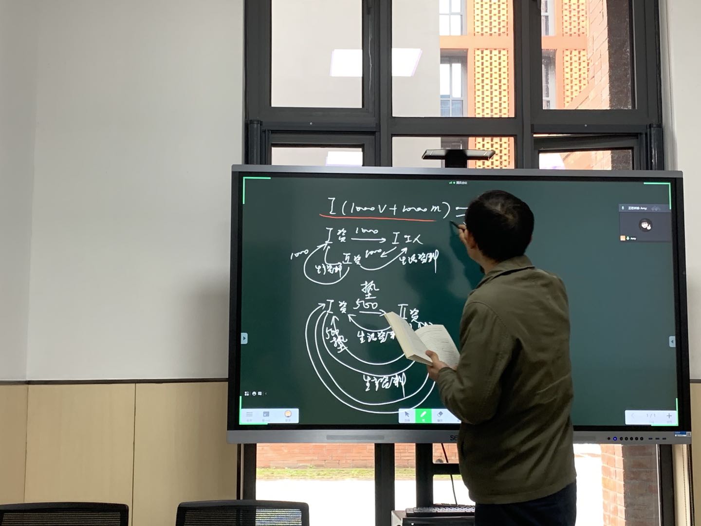 刘老师结合陈岱孙先生《从古典经济学派到马克思——若干主要学说发展论略》一书,通过在白板上作流程图,耐心细致地向大家分解了两大部类之间Ⅰ(1000v+1000m)和Ⅱ20000c的大交换中,马克思阐述的七个具有社会性质的广泛的流通行为。让大家更直观地了解了第一部类对消费资料的需求和第二部类对生产资料的需求都如何得到充分的满足?第一部类和第二部类资本家原有的垫付货币是如何又回到他们手里?以及本年度社会资本再生产的循环是如何完成的?