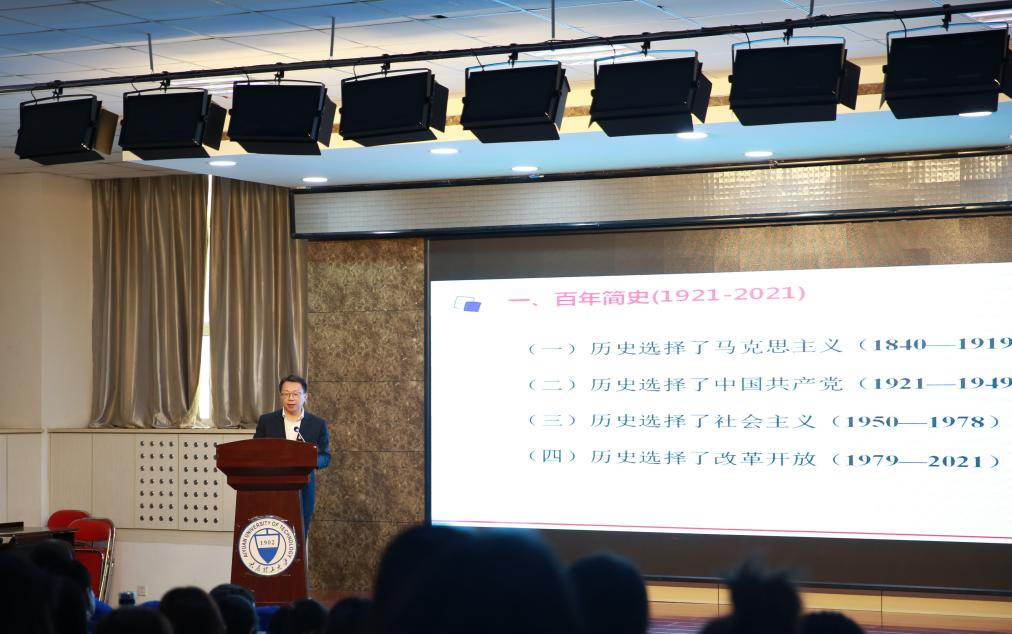 张立程老师理论宣讲主题为“中国共产党的百年探索与历史自觉”。张老师首先回顾了党的百年简史,指明了五次历史性转变与未来。其次,阐述了道路、理论、制度、文化方面的四大探索与四个自信。最后讲述共产党人的历史自觉,并强调立足党的百年历史新起点,更要学史明理、学史增信、学史崇德、学史力行。