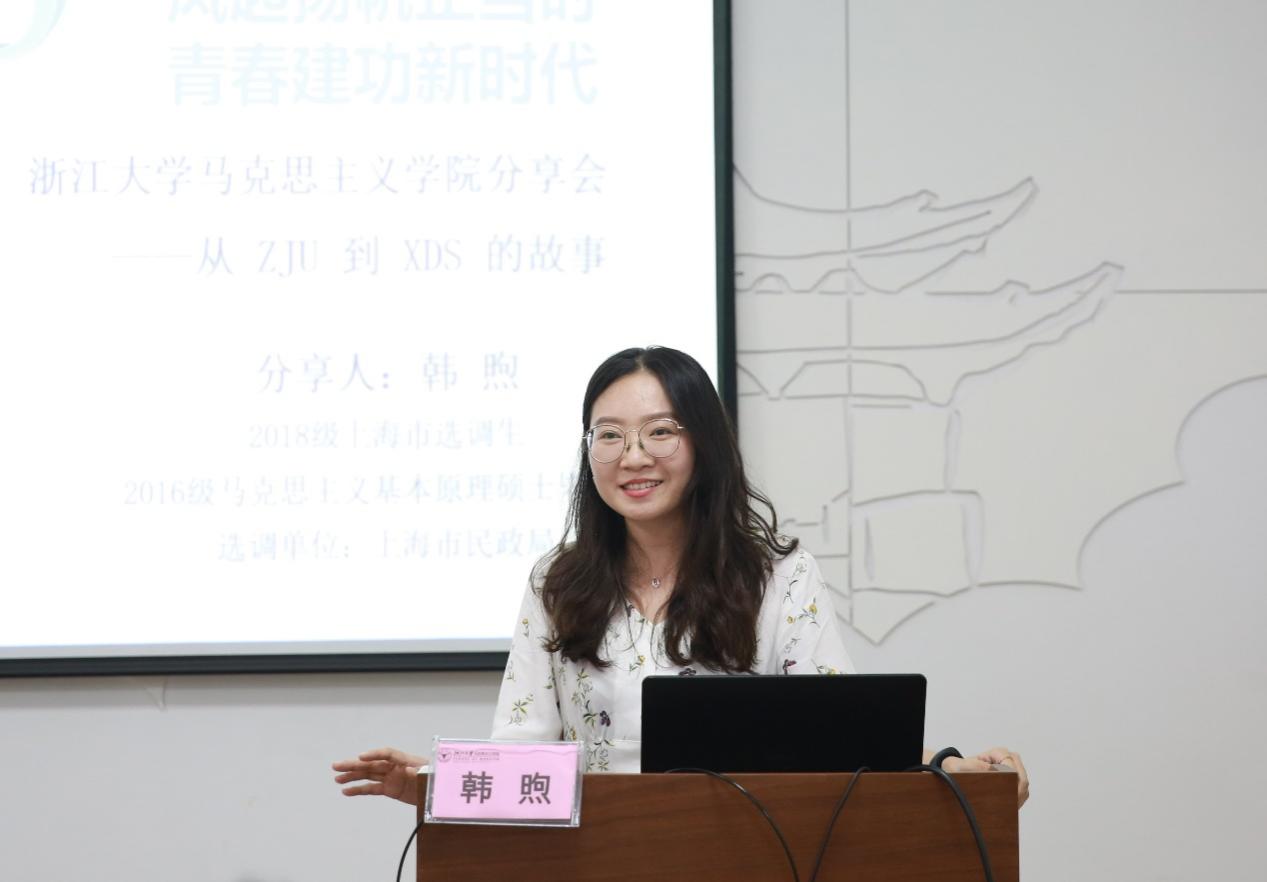 2018届硕士毕业生韩煦学姐用蜕变、选择、炽热、积淀、笃行这五个关键词分享了她在马院的故事、她和选调的故事、她在基层的故事、她和民政的故事以及她在未来的故事。在马院学习的两年时间,韩煦收获了一生难忘的回忆,选择了一生坚定的事业。她曾经问过自己要读博吗?要做老师吗?要进企业吗?通过不断追问自己的内心,最后确信了想考选调生,然后开始了漫长艰辛、心无旁骛的公考之旅,并成功考取上海市选调,目前就职于上海市民政局。在两年选调基层挂职和一年的机关管理工作中,韩煦不仅收获了对民情社情国情的深刻体验和服务基层百姓的能力情怀,更坚定了在工作岗位服务国家社会和人民的坚定信念。最后韩煦学姐祝福即将择业的学弟学妹们找最适合自己的舞台。
