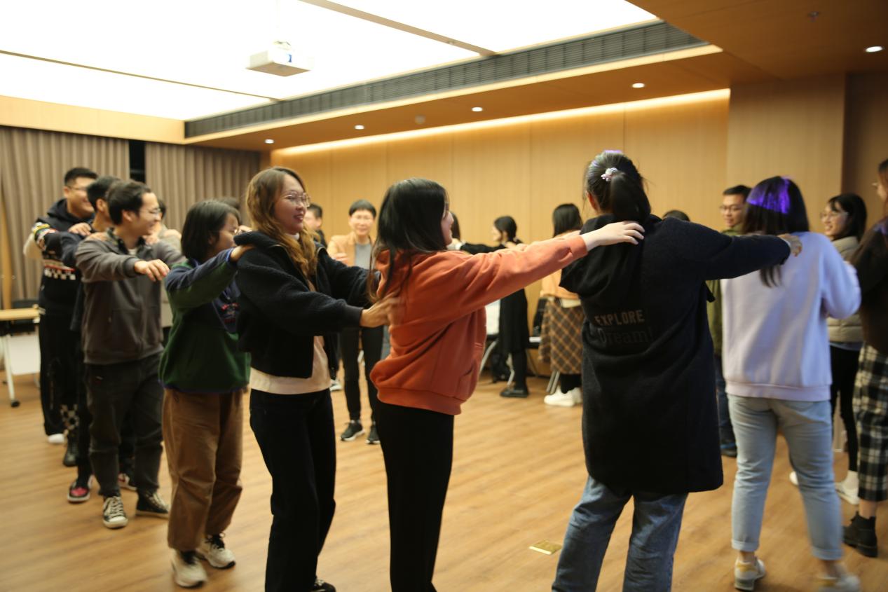 随后,同学们起身围成一个圈,通过“开心消消乐”的热身游戏活跃现场气氛,进入团体状态。同学们再进行分组,小组内部围成小圈开展“滚雪球”游戏,互相介绍姓名、爱好以及性格等关键词,进一步加深彼此的熟悉度。