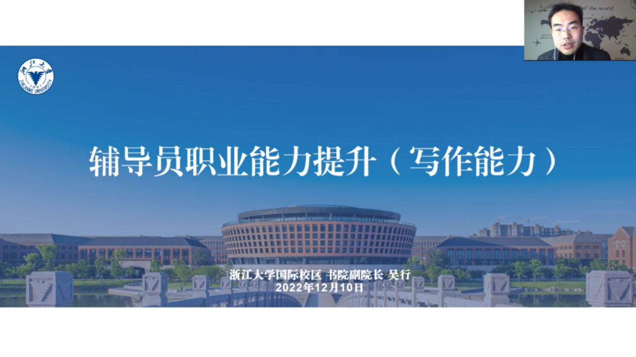 第三场工作坊由海宁国际校区学工办主任吴行主讲,题目是“辅导员职业能力提升(写作能力)”。吴行老师首先阐述了辅导员“为什么要提升写作能力”,并用一则辅导员工作信息简报纠错的实操演练使同学们明确写作的基础性作用。他还列举大量笔试真题,为正在备考的同学们提供技巧建议。其次,吴行老师从网文、基础性通知(活动方案)、讲话稿(含主持稿)、总结性材料以及规范性文件等方面,分门别类并结合实例进行详细讲解。最后,他还通过几道论述题案例与同学们分享“如何提升写作能力”。