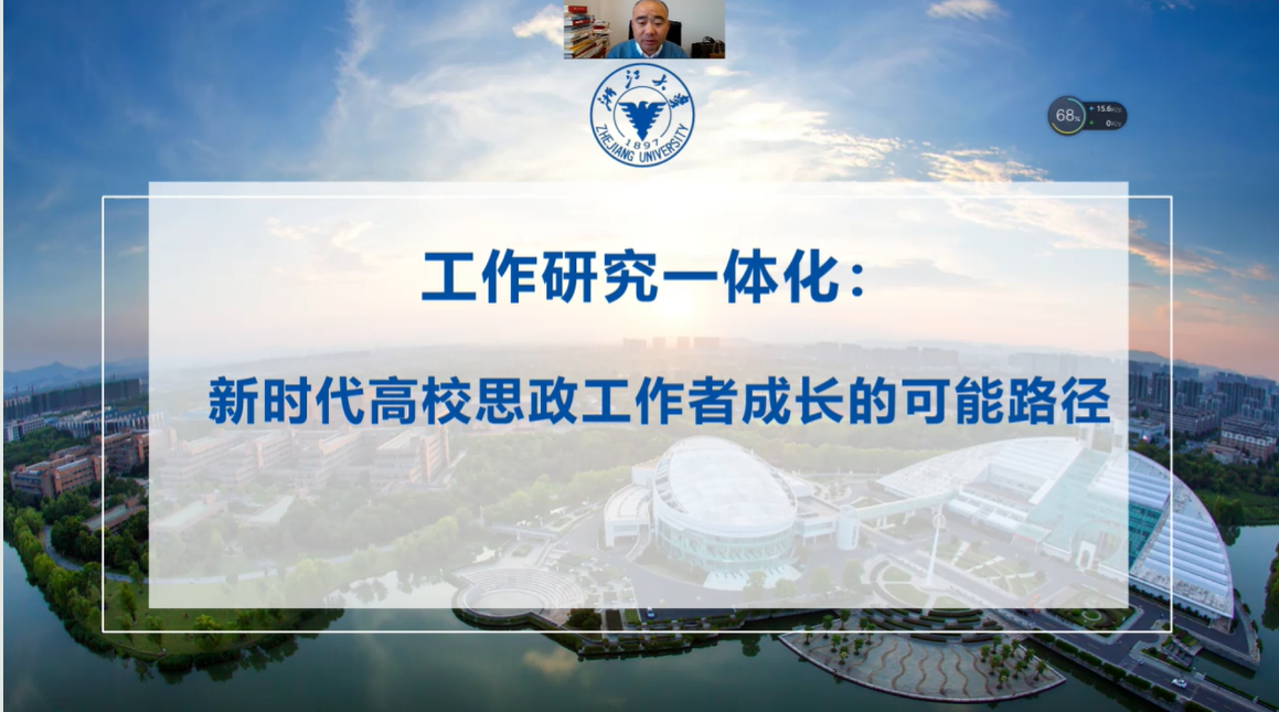 马克思主义学院副院长代玉启教授为同学们带来“工作研究一体化:新时代高校思政工作者成长的可能路径”专题报告。代玉启老师认为工作与研究相结合是新时代下高校思政工作者成长的未来路径。他首先指出当下思政工作存在“急、难、重”的问题,辅导员应以实效超越焦虑、以赋能安身立业。其次,他提出要将工作与研究一体化就必须把握学生与时代特征,并与同学们探讨了当代大学生的特点和时代发展现状。而针对如何做到工作研究一体化,代玉启老师给出三点具体建议:一是找到特色聚焦点;二是建构德育共同体;三是打牢制度硬保障。最后,代玉启老师还为辅导员拓展资源提供了三条路径:“思政课教师+辅导员”“思政课程+课程思政”“思政小课堂+社会大课堂”。