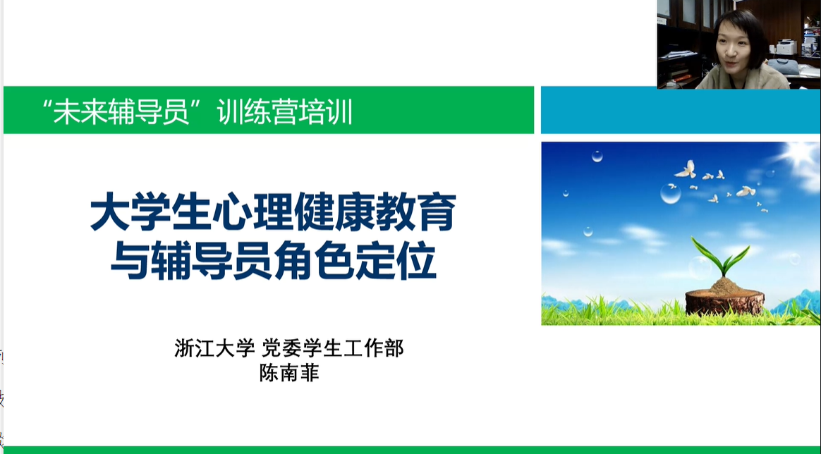 党委学工部学生综合素质教育办公室主任陈南菲老师以“大学生心理健康教育与辅导员角色定位”为主题,从“当代大学生心理状态概况”“辅导员心理助人角色定位”和“辅导员心理助人角色认同”三个方面展开讲解。她基于00后大学生的成长环境,总结了当代大学生群体的另类“心”特征,指出辅导员心理助人工作的角色定位包括:心理健康知识的宣传者和教育者、学生心理问题的识别者和处理者。她还建议辅导员的心理健康工作要构建心理助人工作队伍体系,寻求专业人员帮助,院系分管领导、学校处理中心、医院精神科、学生骨干都是辅导员在具体开展工作时可以充分利用的资源。最后,陈南菲老师指出辅导员在面对角色失调时,可以通过增强识别技能、干预技能、预防技能与沟通技能等来提升胜任力,并向着心理助人工作专业化发展。