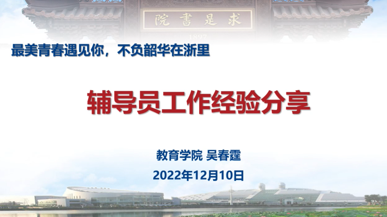 最后一场工作坊由教育学院辅导员吴春霆主讲,主题是“辅导员备考和工作经验分享”。作为一位有着“2+2”辅导员工作经历以及成功考取本校辅导员岗位的年轻辅导员,吴春霆老师从备考和入职后的工作感悟两方面为同学们展开讲解。他结合《普通高等学校辅导员队伍建设规定》对辅导员工作职责的规定,详细讲解辅导员的使命责任,并根据辅导员面试要求,建议同学们结合自身特点发挥优势。同时,他也分享了入职辅导员岗位后的心得体会,向同学们送出“最美青春遇见你,不负韶华在浙里”的美好祝福。