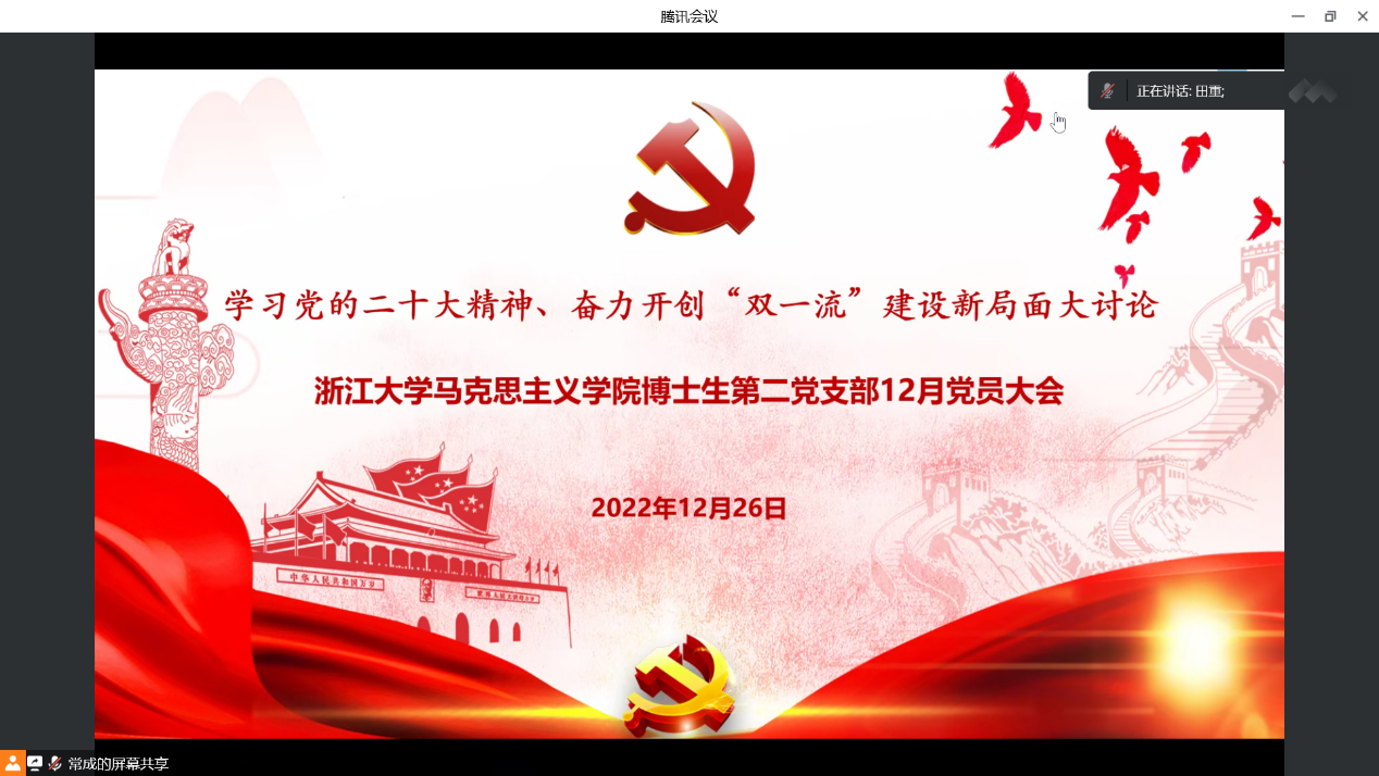 12月26日,马克思主义学院博士生第二党支部以线上的形式召开了12月党员大会。与会同志围绕“学习党的二十大精神、奋力开创‘双一流’建设新局面”展开了热烈研讨、逐一发言交流。