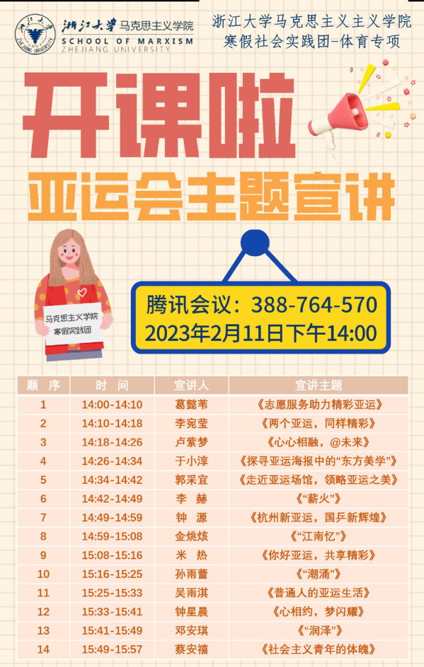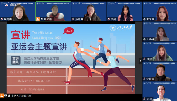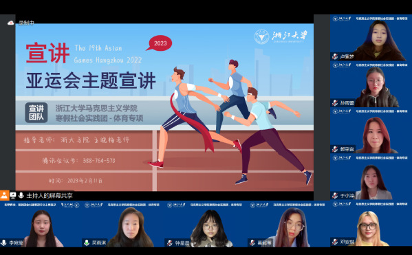 喜迎杭州亚运,赋能“健康中国”。为营造全民参与亚运、服务亚运、奉献亚运的浓厚氛围,来自浙江大学马克思主义学院的14位硕士研究生,在王晓梅老师的指导下,紧密结合第十九届杭州亚运会时间节点,与中西部地区中小学生线上结对,以“普及亚运知识、增强体育锻炼、注入文化活力”为目标,组织开展“一起云支教,共迎亚运年”专项实践活动。团队成员利用寒假时间多方面查阅、了解杭州亚运会相关内容,结合马克思主义学科特色,以杭州亚运为载体,展现“中国式现代化”的文明底蕴与重大成就。通过实践团队的不断讨论、打磨,最后制作完成线上教学课件14套,形成14份课程教案、视频讲解、心得体会,为打造“全民亚运”图景注入了青春力量。