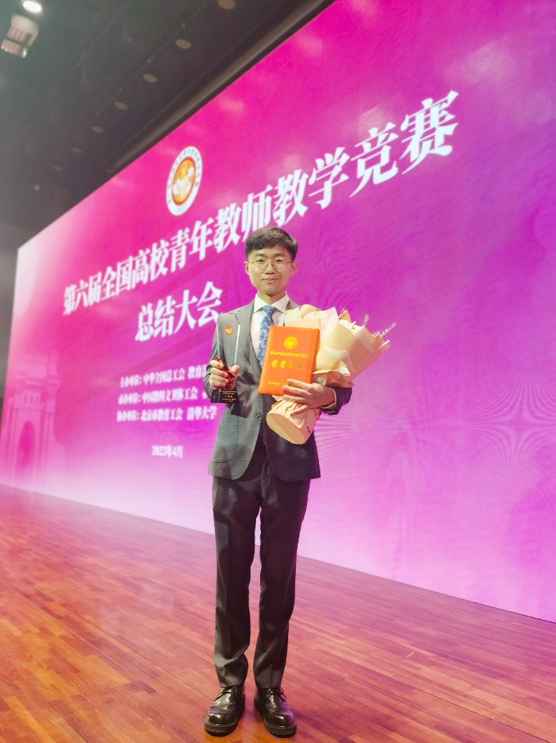 在决赛颁奖现场,赵坤老师作为全体获奖代表发表获奖感言。他表示,从院赛到校赛、到省赛、再到国赛,对教学设计和教学课件数十次的精心打磨,一次次地突破自我,全过程的淬炼和磨砺,这不仅是教学技能与素养的极大提升,也是教学理念与方法的不断更新和完善,更是对教学本质与教学规律的持续探索与体悟。作为一名青年教师,经过了全国青教赛的磨炼,能够更加坚定执着、更加从容自信、更加游刃有余地投入到所热爱的教育事业当中去,投入到为党育人、为国育才的伟大征程当中去,培养一批批有理想、有担当、有才华的创新型人才,这是时代赋予的光荣使命。