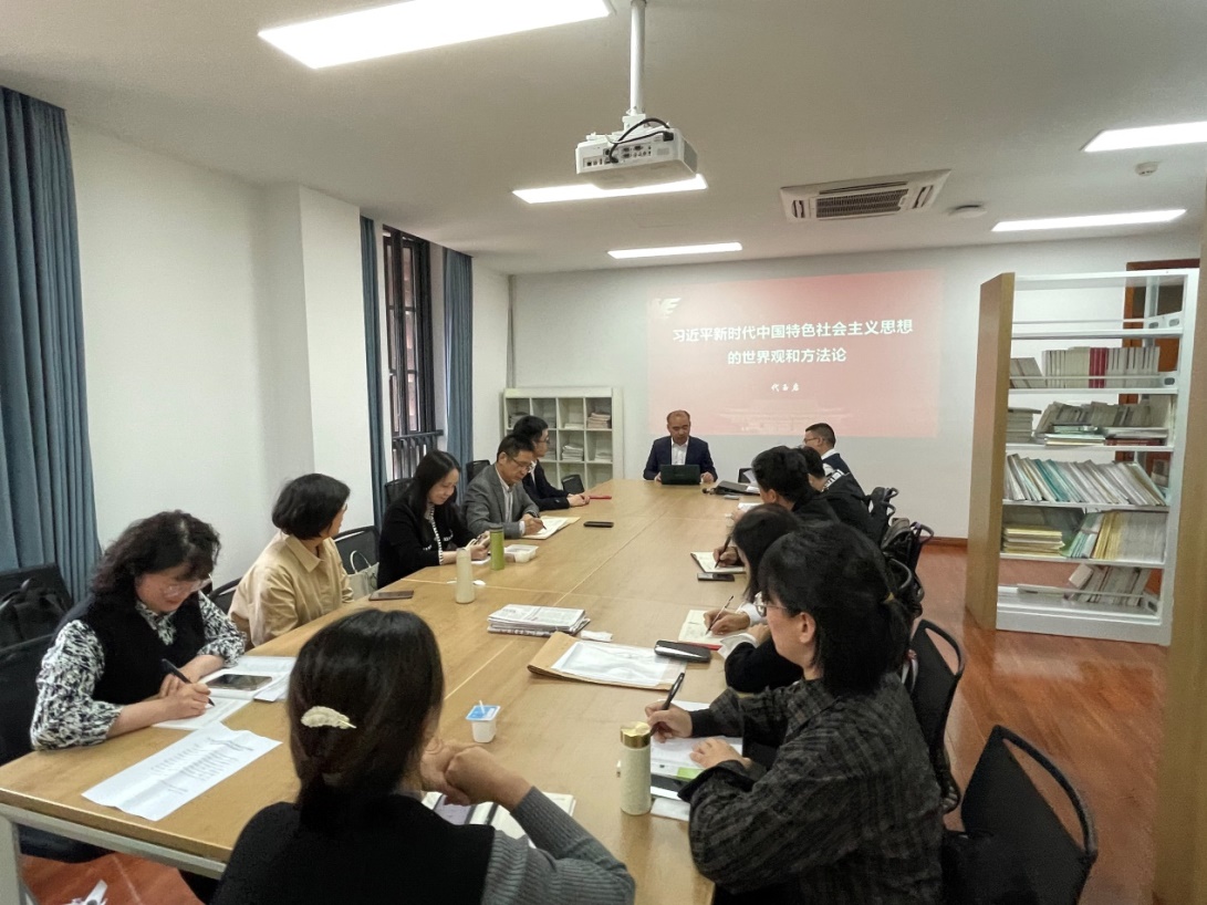 随后,支部书记代玉启教授围绕“习近平新时代中国特色社会主义思想的世界观和方法论”这一主题,为全体党员作报告。他从整体上阐释了习近平新时代中国特色社会主义思想的丰富内涵,包括“十个明确”“十四个坚持”“十三个方面成就”等内容,并重点解读了党的二十大提出的“六个必须坚持”提法以及贯穿其中的立场观点方法。他强调,习近平新时代中国特色社会主义思想是当代中国马克思主义、21世纪马克思主义,是中华文化和中国精神的时代精华。