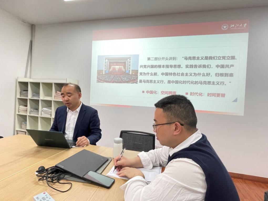 董扣艳老师首先传达了学院党委关于学习贯彻习近平新时代中国特色社会主义思想主题教育的实施方案和工作要求,并传达了习近平总书记对浙江大学重要指示精神。她强调,在新的征程上,思想政治教育研究所教师党员要认真把握主题教育“学思想、强党性、重实践、建新功”的总要求,深刻领会习近平总书记重要指示的精神内涵和重要意义,为学校、学院的立德树人工作作出应有贡献。
