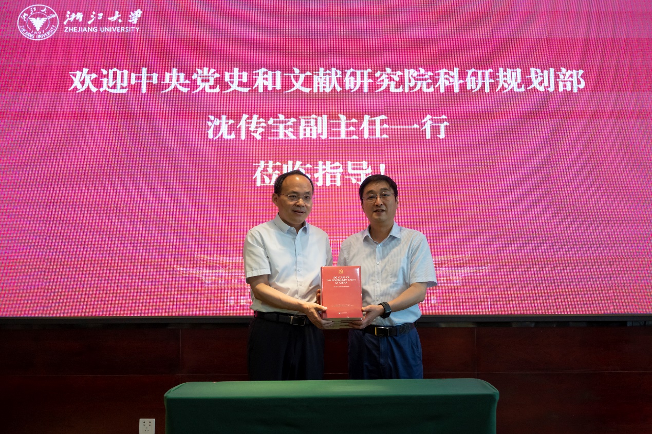 开幕式上,沈传宝副主任向浙江大学赠送了中共中央党史和文献研究院最新出版的研究丛书,黄翔峰副书记代表学校接受赠书并表示感谢。