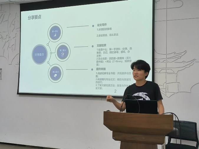 首先,由马克思主义学院2022级党的建设硕士生孙建猛与大家分享自己在文献检索与论文写作方面的一些心得。他着重提到了论文写作过程中史与论之间的关系,认为需要“史论结合,论从史出”。在文献检索方面,孙建猛同学强调了一手资料的重要性,他结合自己的学习经历,对几种不同的资料来源进行了细致的分析,并认为其中的报纸、杂志是重要的资源,且尚未完全开发,值得细细研究。在此基础上,他还向大家推荐了多种检索资料的有效途径,如浏览器、学校图书馆的数据库等。最后,他还向同学们提出了一些提升学术能力的措施:经典书籍的阅读必不可少,多读论文在模仿中进步是提升水平的一种渠道,了解文献检索的方法以积累文献资料是重要的基础。