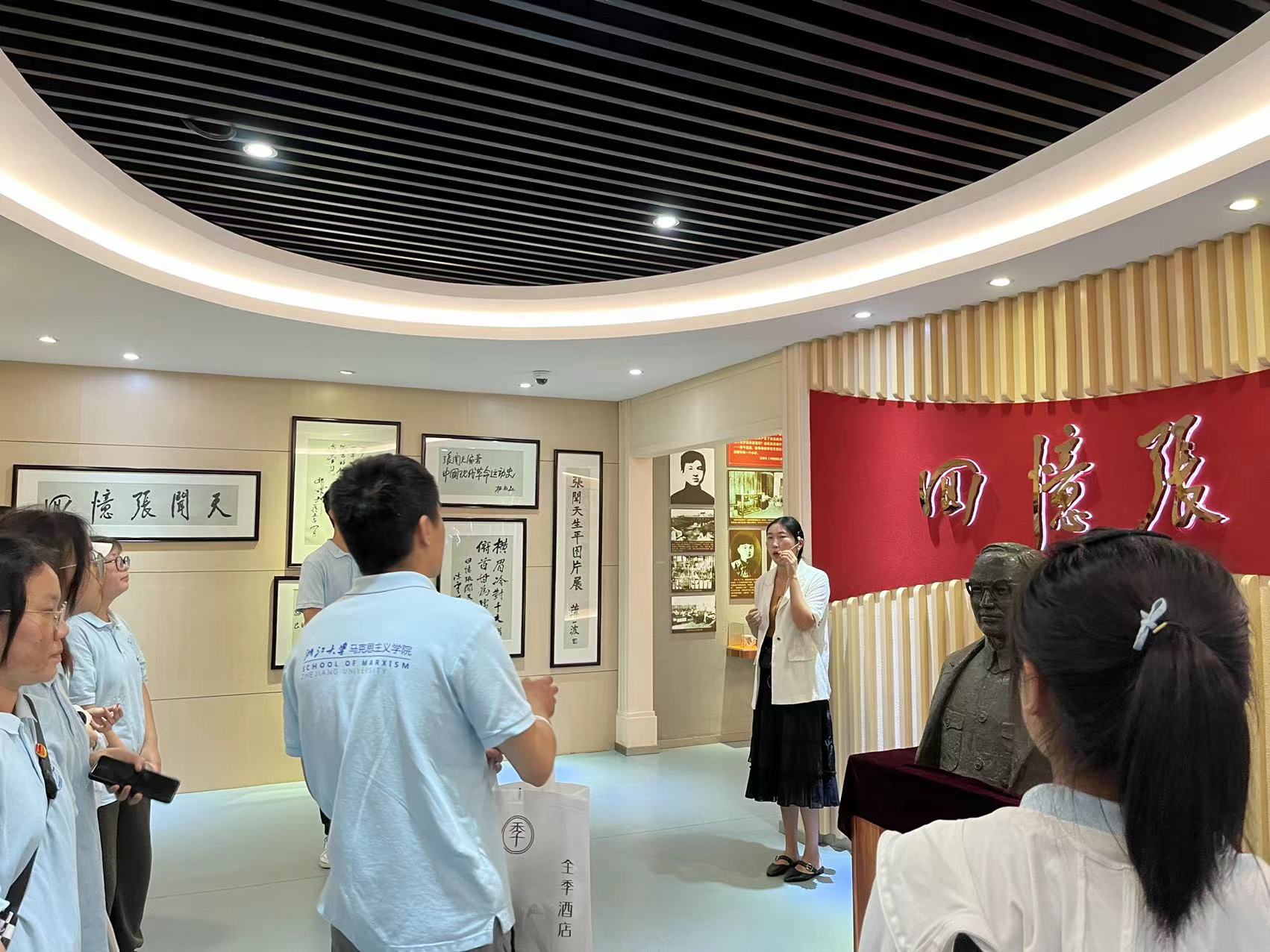 盛夏的南京,阳光透过梧桐树洒下斑驳的光影。社会实践团全体成员在河海大学校门前集合,参观河海大学档案馆、校史馆。社会实践团带队老师浙江大学马克思主义学院党委副书记徐晓霞、浙江大学马克思主义学院讲师赵永帅和班级辅导员王星雨带领三位学生代表在档案馆会议室与河海大学教师代表进行会谈。河海大学马克思主义学院党委书记刘兴平对浙江大学马克思主义学院师生的到来表示热烈的欢迎,他指出:“全国马院是一家,我们要互相交流、互相学习。”之后,河海大学图书馆、档案馆、校史馆党总支书记王志峰介绍张闻天陈列馆建设情况:张闻天是中国共产党重要领导人之一,是河海大学的杰出校友。张闻天从河海走上革命道路,为河海留下了追求真理、追随党和人民、勇担民族复兴大任的红色基因。两院还就学生培养工作展开亲切坦诚的交流,各自分享了特色学术活动、党团学建设和本硕博一体化培养体系等内容,就马克思主义学院本科生培养工作所遇到的困难与挑战交换了意见。