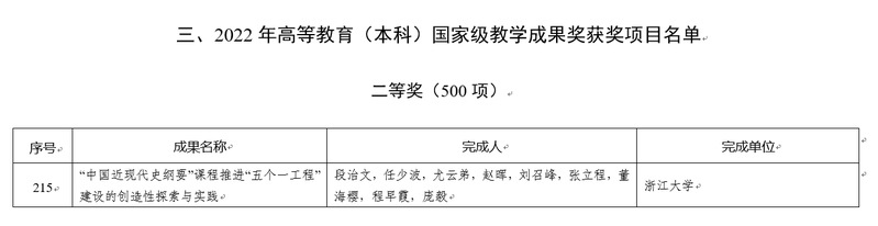 近日,教育部批准的2022年国家级教学成果奖获奖项目正式公布。浙江大学马克思主义学院段治文教授领衔主持,任少波、尤云弟、赵晖、刘召峰、张立程、董海樱、程早霞、庞毅老师参与完成的项目——“中国近现代史纲要”课程推进“五个一工程”建设的创造性探索与实践荣获国家级高等教育(本科)教学成果奖二等奖。