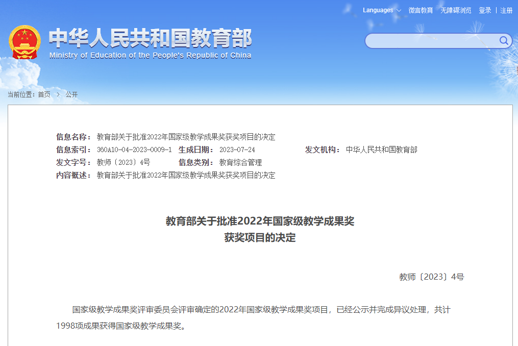 在全国开展教学成果奖评选和奖励工作是国家大力推进高等教育发展的重要举措,是深化教育教学改革、提升高等教育内涵建设的有力抓手。国家级教学成果奖每四年评选一次,是对全国教育人才培养和高质量教育教学改革成果的检阅和展示。