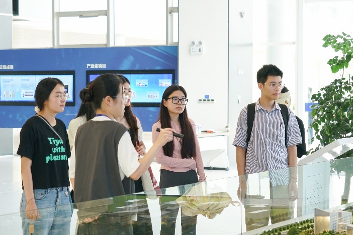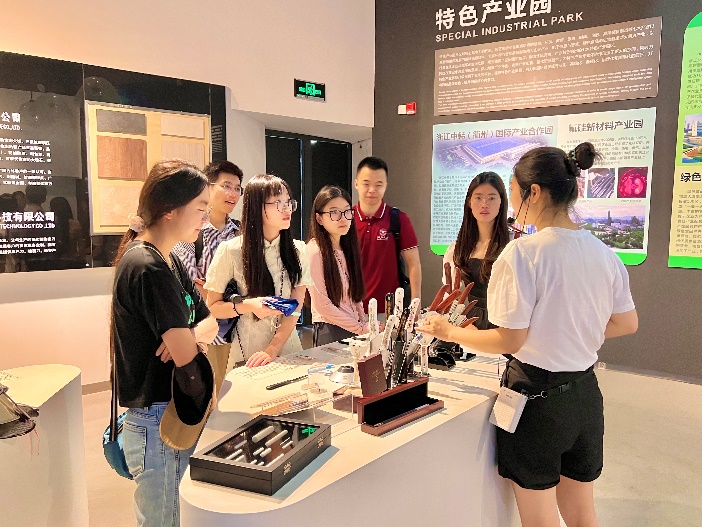实践团成员首先来到浙江衢州智造新城展览馆,了解新区的发展沿革。衢州智造新城聚焦高端产业,定位于打造振兴衢州的产业高地,在“工业强市 产业兴市”的战略牵引下,明确提出“大干三年 再造新城”奋斗目标,主要发展“5+X”产业,即新材料、新能源、集成电路、高端装备、生命健康等五大主导产业,以及特种纸、高性能特种钢和其他金属材料与制品、特种皮革等传统优势产业。其中,新材料产业聚焦氟硅新材料、锂电新材料、电子化学材料三大板块,是省高端电子材料“万亩千亿”产业平台;新能源产业聚焦动力电池、储能电池、光伏三大板块,先后落地了吉利“三电”、鹏辉储能电池等重量级项目;集成电路产业拥有从硅单晶、研磨片、抛光片、外延片到芯片制造的完整产业链,是省级集成电路产业基地;高端装备产业拥有全球最大的气动凿岩机等制造企业;生命健康产业聚焦生物医药、医疗器械、绿色食品三大板块,集聚了明旺乳业、东鹏特饮、马迭尔等一批著名企业。为了更好地服务于项目落地,衢州探索出了“孵化在外地、产业化在本地”的模式,重点打造杭州科创产业园等“四大科创飞地”,着力招引、孵化一批科技含量高的高端项目,在技术研发和科技创新中抢占发展先机,同时在智造新城内精心打造本区域内的研发基地,提升自身创新能力。