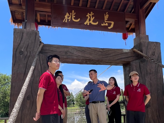 石梁镇麻蓬村为著名武侠小说作家金庸先生的求学地。近年来,麻蓬村充分融合武侠元素,打造一系列景观节点。实践团队成员踏上了金庸笔下的“桃花岛”,走进了“牛家村”,游览了“龙门客栈”,深入感受武侠文化的同时,更体会了“千万工程”实施下麻蓬村的美丽蝶变。
