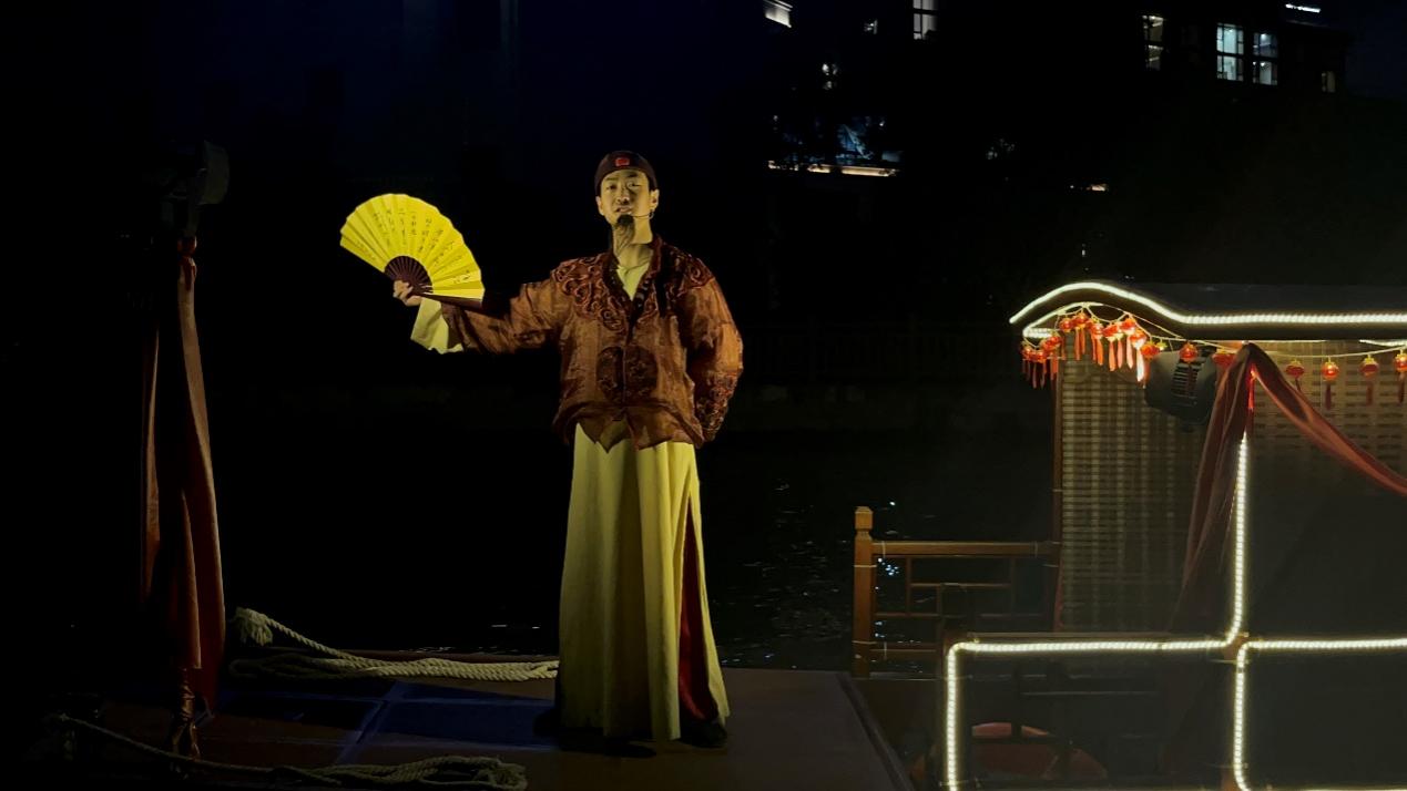 郭璞画城、韦庸治水、江山揽胜……随着游船拔开塘河缓缓行进,人们仿佛在梦幻光影里穿越古今,身临其境般去感受温州城的秀美风光与深厚底蕴。一部东瓯史,半部在塘河。实践团来到进行式夜间演出的现场,在古色古香的行船之上,切身体会温州的“古往今来”,被沿线大量河居、榕亭、古桥、农耕等旅游资源吸引目光,被蕴藏着学术思想、民俗工艺、诗词戏曲的台词文本引发思考,更被精彩绝伦、动静相宜的光影舞台线路唤起记忆。
