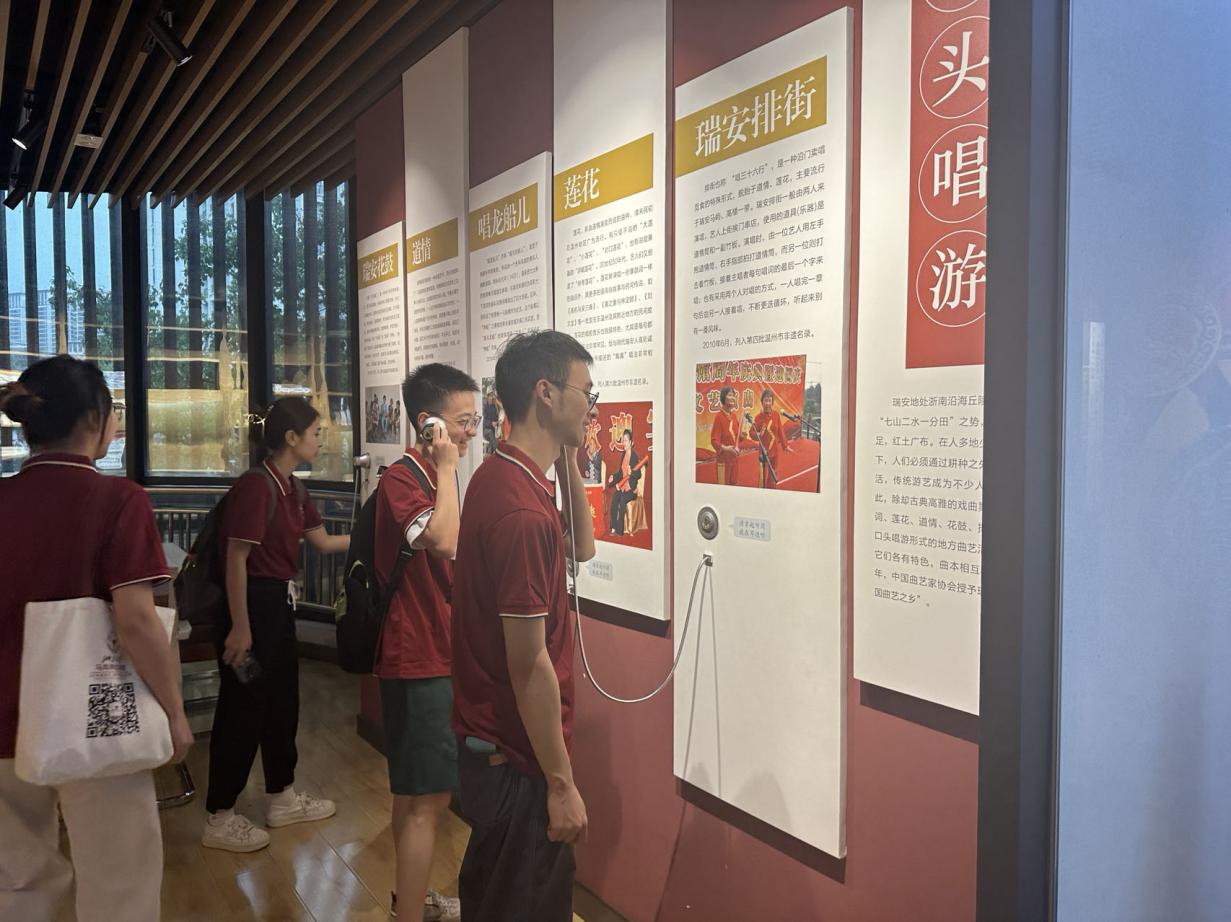 非遗馆以“云山云水”为主题,将展陈划分为序厅、云江乐舞、云江烟火、云江匠心这四大板块。有包括联合国级的中国活字印刷术、国家级的木活字印刷术、温州鼓词、藤牌舞、蓝夹缬技艺等等非遗文化一百多个。在这里实践团逐步深入了解并感受了温州特有的非物质文化遗产——在尝试木活字印刷术时惊叹古人的智慧,在聆听温州鼓词时领略方言的魅力,在观赏藤牌舞时感慨武与美的融和,在感受蓝夹缬技艺时赞叹技术的进步。