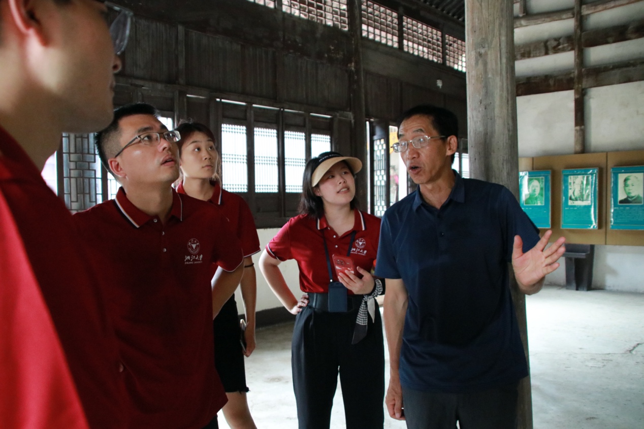 图5 枫桥镇干部周主任向绍兴实践队成员介绍紫薇侯庙的历史