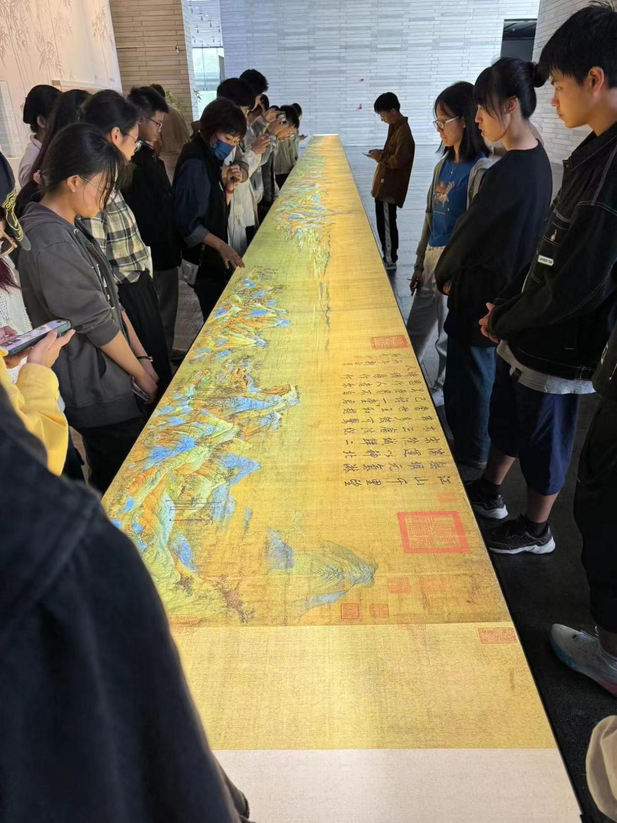踏入现代范十足的博物馆,首先映入眼帘的是一幅纵贯中厅的北宋画家王希孟的名作《千里江山图》,电子化的呈现形式淋漓尽致地展现了中华优秀传统文化创新性发展的路径,虽减了几分原画的穿越历史的古朴,却也翻出了时代的新意,给人以别样的厚重与震撼。恰如同学所言:今日我们能“于画中一窥雄浑壮阔的青绿山水”是何等有幸。“当这卷名画完整地呈现在我面前,我还是为其中群峰错落、青绿婉转的大宋盛极山河和壮阔的千里江山所深深震撼。”