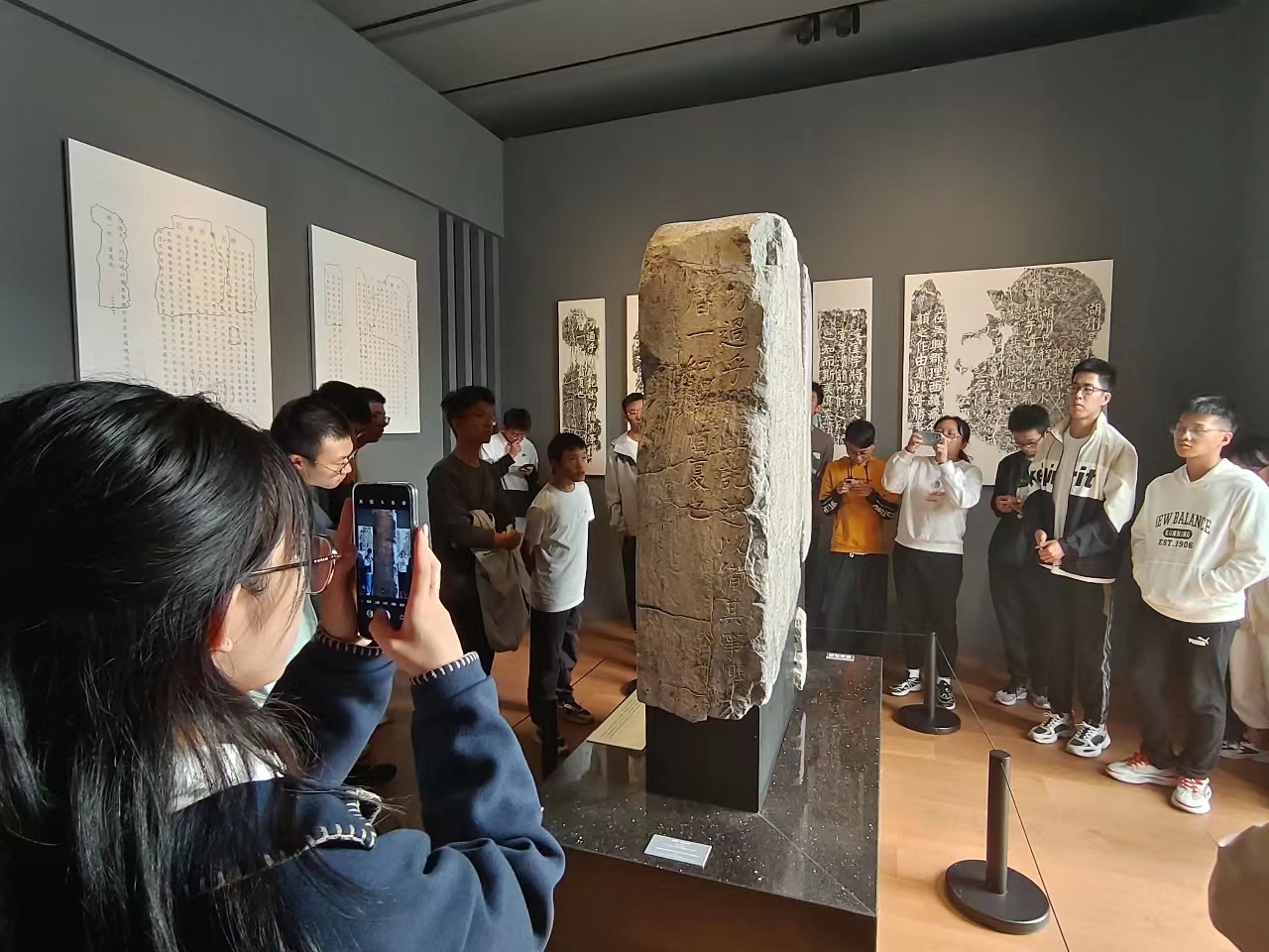 其中最令人难忘的当属中国历代瓷器的精品展览,讲解员老师向同学们一一介绍了从古代的陶器到瓷器的演变历史,唐代南青北白的瓷器特色,四大名窑的兴衰,湖州瓷器的产生,景德镇瓷器“笑”到最后的秘诀……无一不令同学们大开眼界,观展过后的同学们都表示对中国瓷器的历程有了更加丰厚的理解,而最引人深思的莫过于讲解员老师所说的景德镇青花瓷背后所蕴含的居安思危意识:在景德镇已经可以将青瓷制作得炉火纯青时,它依然选择进军自己并不擅长的白瓷,并在最终创造出了青花瓷,可能这也是龙泉窑没落后景德镇兴盛至今的原因之一吧,古人云:以史为镜,可以知兴替,厚重的瓷器史也让同学们明白了创新的深刻含义。镜头一转,来到艺博馆的镇馆之宝,来自颜真卿的石碑真迹,那在湖中静默千年的石碑真迹虽然残破,却仍旧不屈地挺立,伴随着对颜真卿一生故事的讲解,原先脑海里一个单薄书法家的印象逐渐充实了起来,呈现在我们面前的,不仅是一个才华横溢,笔体楷模的文人,更是一个有勇有谋,忠勇坚毅的国士,他身上也正是德才兼备的生动体现,同学们也莫不折服于颜真卿才学与气节兼备的崇高人格光辉。
